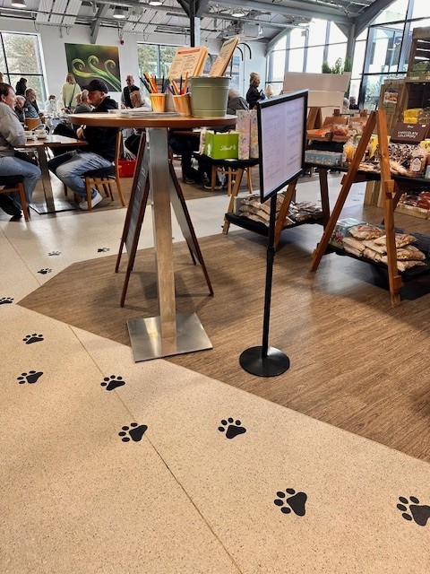 WE WELCOME DOGS IN OUR CAFE, JUST FOLLOW THE PAW PRINTS FOR THEIR DESIGNATED AREA.