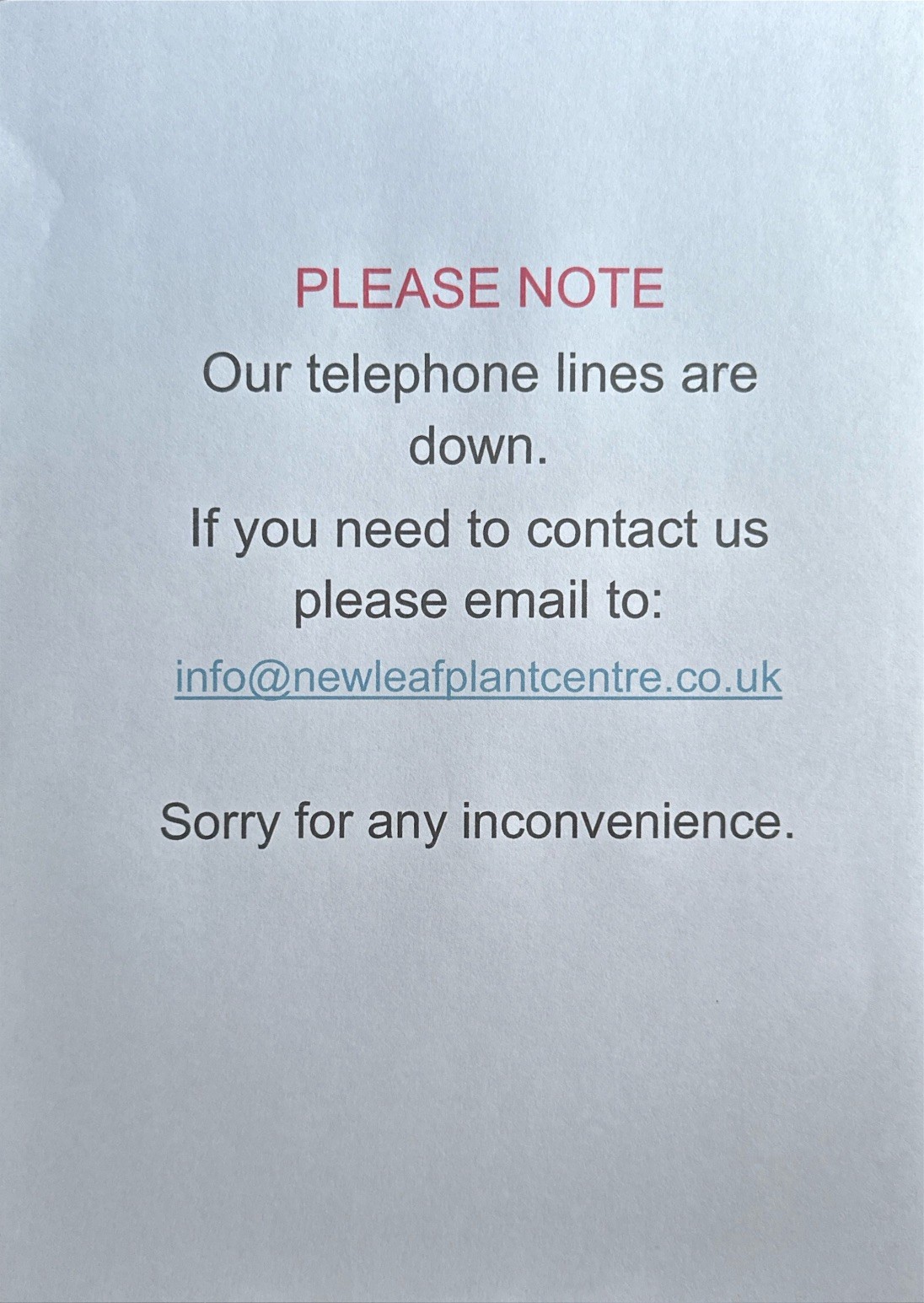 If you need to contact us please send an email to:  info@newleafplantcentre.co.uk